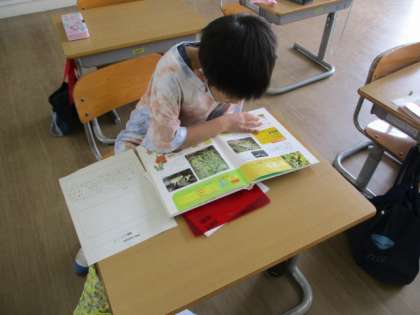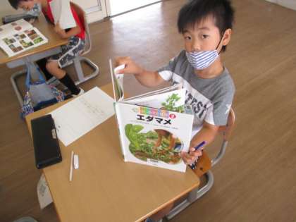 「これから必要になるものはなんだろう?」と、おいしい野菜を収穫するために子供たちはじっくり図鑑を見ていました。