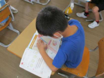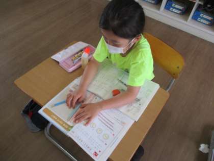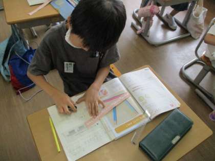 長さの学習をしています。物の長さの適切なはかり方を確かめてから、実際に紙のものさしを使ってみました。