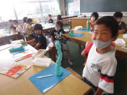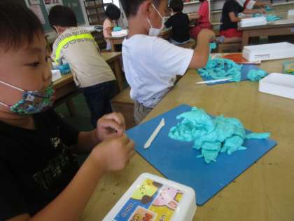 3・4時間目の図工は、図工室でねんどをしました。ねんどで高いタワーを作ったり、たくさんまるを作ったり、きれいなまるを作ったりしました。その後子供たちは、練習でいろいろな形を作った経験を生かして自分の作品をつくりました。どれも子供たち一人一人の個性が光るすばらしい作品ができました。