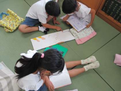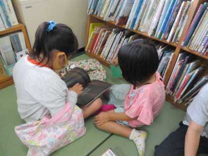 図書室利用の日でした。たたみのスペースで各々本を読んでいます。おもしろい本を見つけたようで、口ずさみながら読んでいる子もいました。