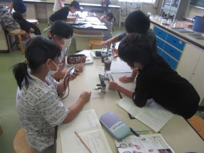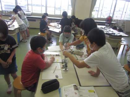 【4年生】水がしみこむのはどちらの土かな 公開日 2020/07/06 更新日 2020/07/06 4年生 理科室での久しぶりの実験です。畑の土と花壇の土ではどちらが水は染みこむのかを実験で調べました。水が染みこむ様子をよく観察する姿が素晴らしかったです。