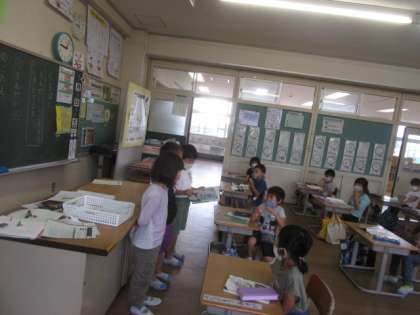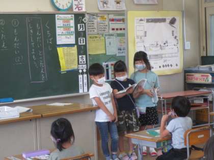 【1年生】国語で音読したよ! 公開日 2020/07/08 更新日 2020/07/08 1年生 現在国語の授業では、くちばしを学習しています。今日は、文章を説明・問題・答えの3つに分けてそれぞれ役割を決めて文章を読みました。子供たちは3〜4人の各グループごとに分かれて練習を行い、授業の最後に発表を行いました。問題を読む人は相手に問いかけるように工夫して読み姿も見られました。