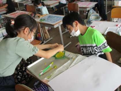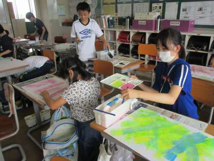 図画工作科では、「心のもよう」という学習に取り組んでいます。絵の具を使って、思いのままに描き表しています。今の心はどんなもようになるでしょうか。