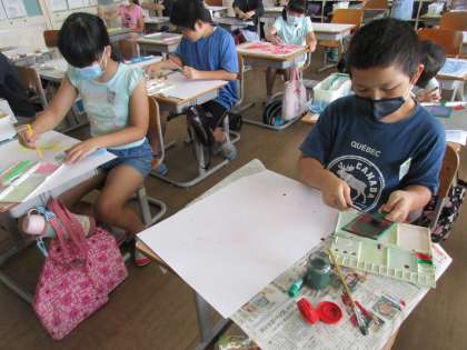 画用紙の大きさや形を工夫したり、ブラシやローラー、ビー玉等の道具を工夫したり、いろいろな表し方を楽しんでいました。