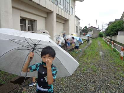 今日は雨だからこそ見えるものや音を探しに、みんなで傘を差して学校の周りを回ってみました。葉っぱの上でキラキラ輝く雨の大粒や、体育館の屋根から勢いよく落ちる雨が傘に当たる音など、子供たちは五感いっぱいに雨のおくりものを見つけて楽しんでいました。