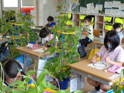 すくすくと大きく育ったあさがおを、教室に運ぶと、まるでじゃんぐるのように繁り、子供たちが見えないほどです。一生懸命カードを書いていました。