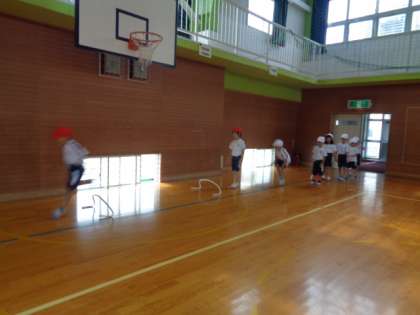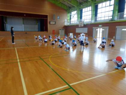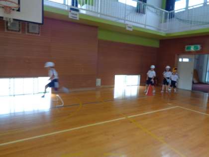 今日も体育館の周りをいろんな走り方で走りました。前回うまくいかなかった横跳びを初めに練習してから再挑戦です。とってもリズミカルにターンターンとできるようになりました。この横跳びは、スポーツテスト(毎年実施していますが今年はコロナのため中止しています)の反復横跳びの動きです。どんどん練習して上手になってほしいです。
