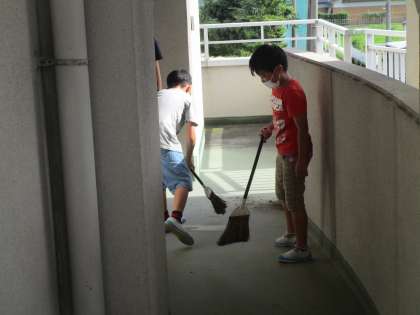 朝の時間に準備を終えた子供たちに声をかけ、非常階段の掃除の手伝いをしてもらいました。快く引き受け、たくさん働いてくれました。「いつも家で手伝っているから。」と言って、慣れた手つきで掃いてくれている子もいました。きれいになったところを見て、「また手伝いたい。」と言ってくれました。また、よろしくお願いします。