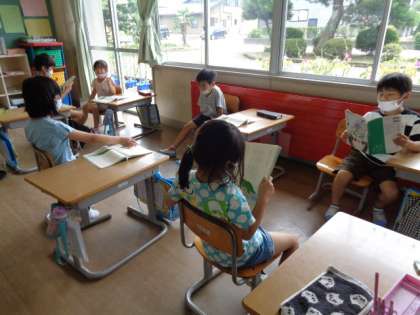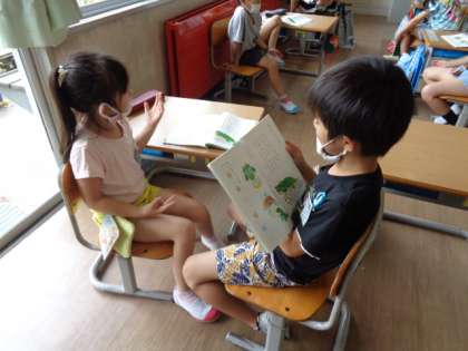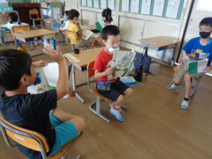 助詞「はをへ」を使った歌をペアで音読しました。リズムに乗って楽しくがんばっていました。