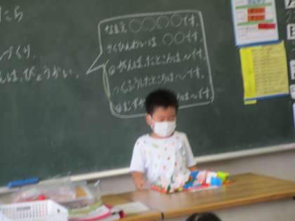今日は、先々週から行っているおってたてたらの作品を仕上げてクラスのお友達に発表しました。作品発表会では、工夫したところ、がんばったところ、難しかったところのうちから自分が一番お話ししたいエピソードを選んで発表しました。