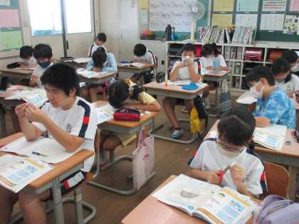 【5年生】形も大きさも同じ図形は? 公開日 2020/07/29 更新日 2020/07/29 5年生 合同な図形の学習に入りました。形も大きさも同じ図形はどれか調べる方法を一人一人考え、確かめていました。