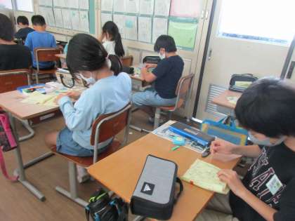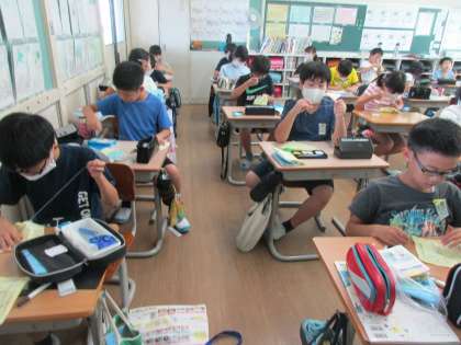 家庭科の授業では、自分の名前の縫い取りをしました。玉結びや玉留めもなかなか難しいようです。しかし、コツをつかんでからは、糸で名前をしっかりと縫い取ることができる子供も増えてきました。難しいからこそ、「できた!」と嬉しそうな様子が声や表情に現れていました。