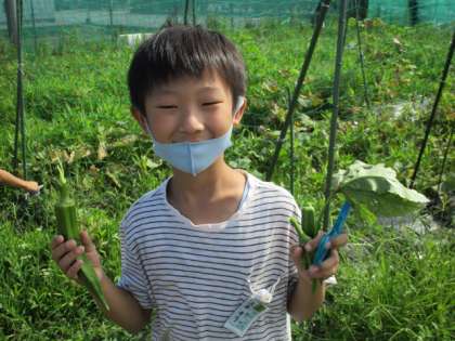 ミニトマトを両手いっぱいにどっさりとれて嬉しそうな様子や、大きなオクラをとって見せてきてくれた子もいます。