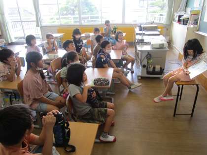 【3年生】読み聞かせ隊の読み聞かせ 公開日 2020/07/31 更新日 2020/07/31 3年生 今日も読み聞かせ隊の子供が「おじゃぶりだいすきニーナちゃん」の読み聞かせをしてくれました。最後はとてもほっこりするお話で、子供たちもにこにこしていました。