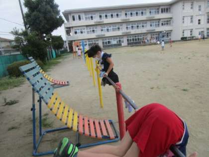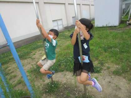 なかよしタイムの活動の様子です。鉄棒で逆上がりを練習したり、築山でシロツメクサのかんむりをつくったり、のぼり棒で遊んだりしていました。各々がそれぞれの時間を楽しんでいました。
