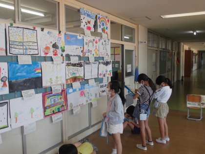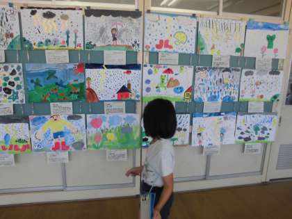 図工では、私の梅雨の絵を鑑賞しました。色づかいや表現した物を工夫したことなど、よさをたくさん見つけていました。ペアでお互いのよさを伝え合いました。見つけたよさを今後の作品に取り入ってほしいと思います。