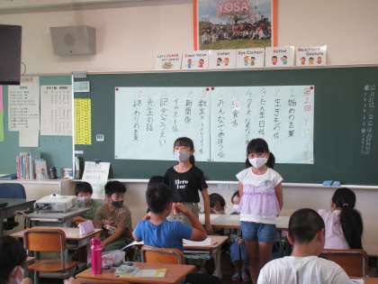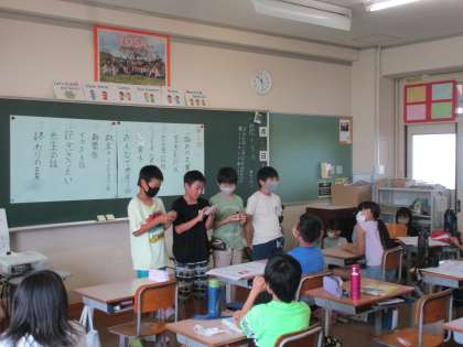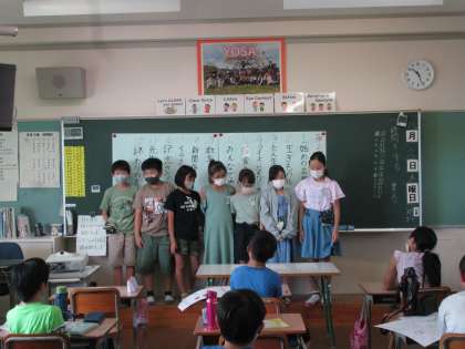 学級集会を行いました。今日まで係ごとに計画し、準備を進めてきました。司会の子供を言葉をはきはきと言い、担当の係の子供たちは自分たちの取り組んできたことを発表していました。始めや終わりの言葉を言う子供も分担し、上手に言えていたと思います。集会をするときにうまくいったこと、難しかったこと等、自分たちで経験したことはきっと自分の成長につながります。また2学期も集会をしましょうね。