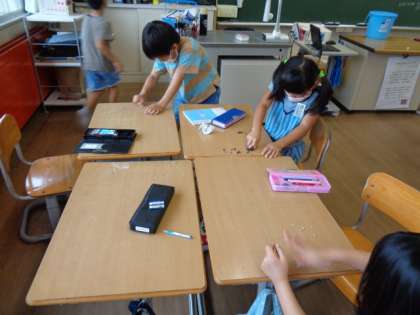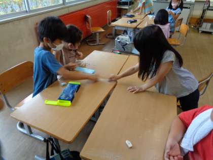 入学式から机に貼ってあった名前のラベルシールを剥がしました。ベトベトでかなりやっかいでしたが、みんなで力を合わせて消しゴムとメラミンスポンジでつるつるのピカピカの机にしました。2学期からも気持ちよく使えそうです。