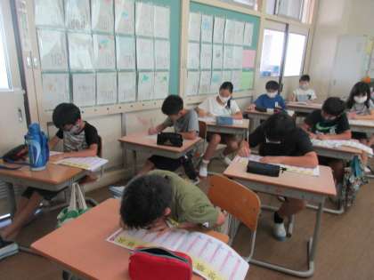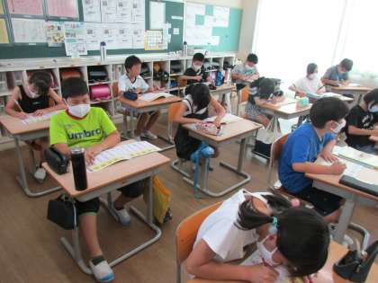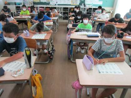 2学期の漢字の学習をしました。読み、熟語等をみんなで確認し、練習です。練習の際も、目を閉じて書くことができるまで指書きをしてからえんぴつを持って書くステップを踏み、定着を図ります。どの子も集中して取り組んでいました。