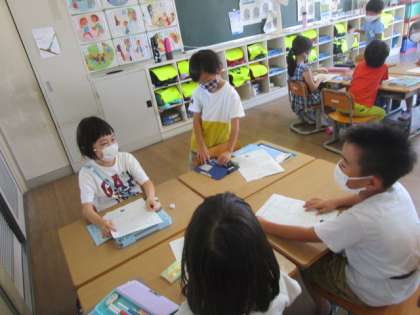 【1年生】ききたいな ともだちのはなし。 公開日 2020/08/19 更新日 2020/08/19 1年生 国語の時間に、夏休みの思い出をお友達にお話ししました。グループごとで一人一人時間をとって発表しました。時間が余ったグループはお話をしてくれたお友達にたくさん質問をしていました。すてきな夏休みを過ごしたようで聴いていて心が温まりました。