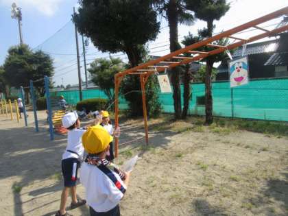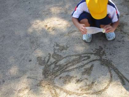 生活科では、水曜日に計画を立てて準備してきた水遊びをしました。子供たちは今日のためにおうちからケチャップの空やペットボトル、紙をとった骨組みだけのうちわを用意してきました。子供たちは、的当てをしたり、絵を描いたり、水の飛距離を競ったりして思い思いに楽しみました。