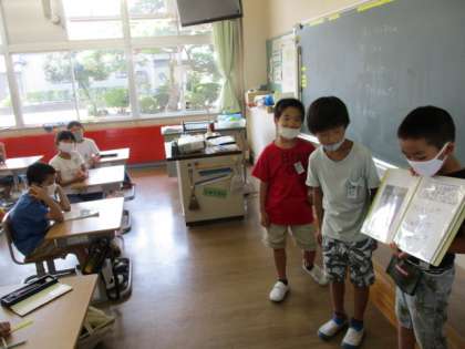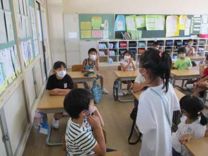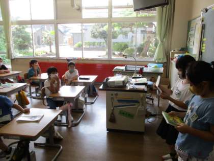 金曜日のお楽しみ会の様子です。新しいお友達の歓迎会をしました。写真は、質問コーナーや、神保クイズ、おすすめの本紹介をしている様子です。