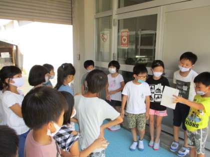 【2年生】お楽しみ会2 公開日 2020/08/24 更新日 2020/08/24 2年生 こちらは、図書室と体育館を案内している様子です。図書室と体育館は、子供たちが自ら紹介したいと言って選んだ場所です。 大きな声で発表ができました!