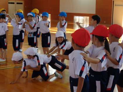 今日はジャンプの学習の2時間目。「まえ・よこ・いっしょ」ゲームで楽しくジャンプを練習しました。みんな楽しそうです!