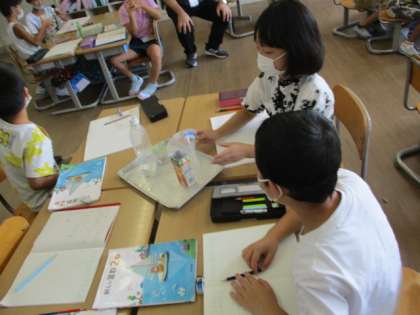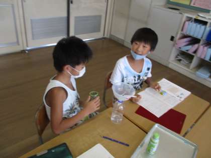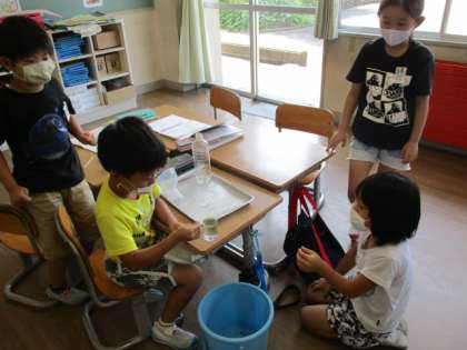 グループになって、水のかさをデシリットルのマスを使って調べました。協力して計ったり、準備や片付けができました。