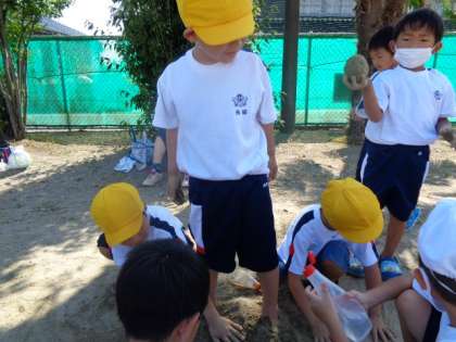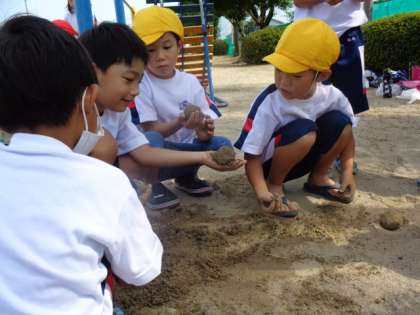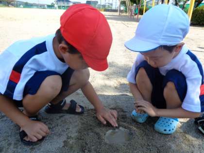 泥遊びに夢中の子供たちです。固くきれいな泥団子を作ったり、山から水を流して川をつくったり、友達の足を泥で埋めたりと、とても楽しそうに遊んでいました。
