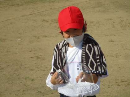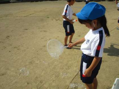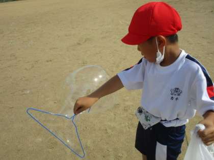 シャボン玉液を教室でつくって外に持って行きました。シャボン玉では、ハンガーを使って大きなシャボン玉を作っていましたが、これがなかなか難しく子供たちは何度も挑戦していました。また、できたシャボン玉を上手にキャッチしているお友達もいました。