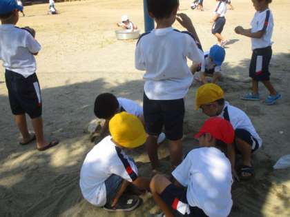 泥団子を作っている様子です。水と土を合わせて形を整えてその上からさらさらな砂をかけてきれいな泥団子を作っていました。中には、お友達の足を埋めている様子も見られました。