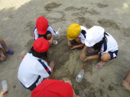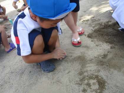 泥団子を作っている様子です。水と土を合わせて形を整えてその上からさらさらな砂をかけてきれいな泥団子を作っていました。中には、お友達の足を埋めている様子も見られました。