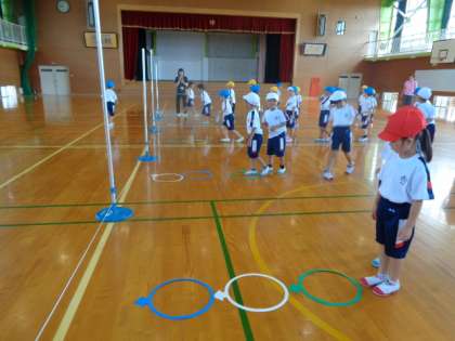 今日もジャンプの学習の続きです。連続で横跳びをしたり、「タンタンターン」のリズムで跳んだりしました。とっても上手でした。