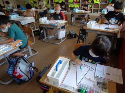 今日は帽子にクレヨンで自分で好きな模様を描いて、絵の具を2色混ぜて、新しい色を作りながら塗りました。「うわあ、きれーい!」「先生見て見て」と心を躍らせながら色を塗っていました。世界に一つだけの、可愛いすてきなとんがり帽子が完成しました!