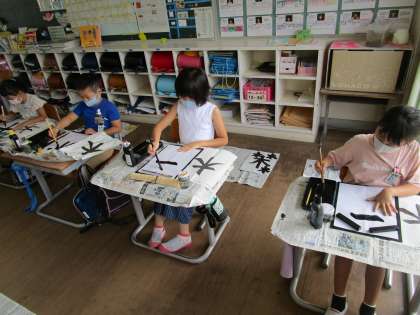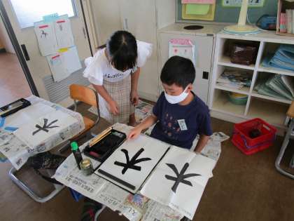 毛筆の学習では、右はらいと左はらいの筆遣いに気を付けて「木」を書きました。はらいのポイントを確認し、友達にアドバイスをもらいながら緊張感をもって書きました。右はらいを書くコツを掴み始めた子供もいるようです。