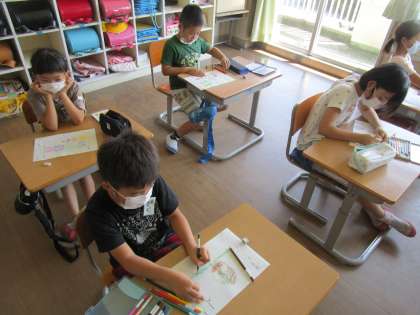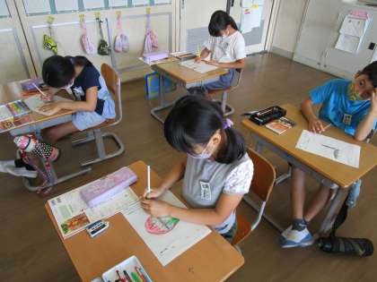 【3年生】図工 ことばから形・色 公開日 2020/09/02 更新日 2020/09/02 3年生 図画工作科「ことばから形・色」の学習では、「たまごの中のたまご」という詩を読んでイメージしたことを絵で表しました。同じ詩を聞いていても、人によってイメージしたことは違い、友達の作品を見合いながらそのおもしろさに気付いていました。次回からはお気に入りの詩を選び、イメージしたことを表していこうと思います。