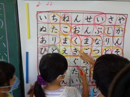 ますに並んだ平仮名から、隠れている言葉探しをしました。びっくりするくらいたくさんの言葉を見つけることができました。楽しかったですね。
