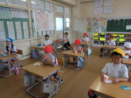 毎週木曜朝のフッ素洗口、味や臭いが苦手な1年生。「ん〜〜!!」と毎回うなり声を出しながら30秒間ブクブクうがいです。みんなでまずさを共有し合ってちょっと楽しそうでもあります。強い歯づくりのためだ。がんばれがんばれ。