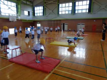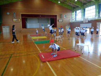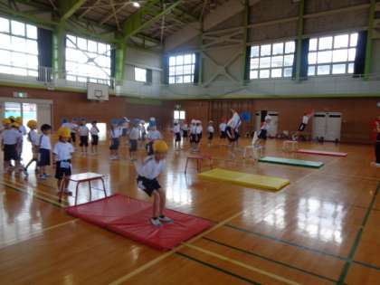 今日の体育では、台の上から両足着地、その後は1・2・3!の助走からジャンプして、両足で着地する練習をしました。随分上手になってきました。