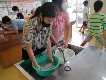今日、6年1組は、家庭科で洗濯の学習を行いました。バケツや洗面器の中に水と洗剤を入れ、手洗いしました。家でも自分で洗濯をしているという子供もおり、自分のことは自分でできている子供がいることに感心しました。また、洗濯の大変さを感じている子供もいました。この経験を家庭でも生かしてほしいです。
