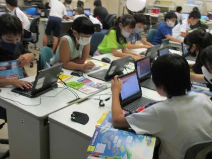 水産業の盛んな地域の学習のまとめとして、パソコンでまとめることに挑戦しています。文字の大きさ、色、アニメーション等、工夫しています。