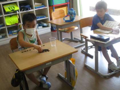 5月から育てているあさがおも茎や葉が茶色く色づいてきました。子供たちは、7月・8月の時のあさがおと比べて観察カードに気づいたことや発見したことを書きました。観察が終わった人から、あさがおの種を取ったり、数えたりしました。算数で習った10ずつの数え方が身についています。