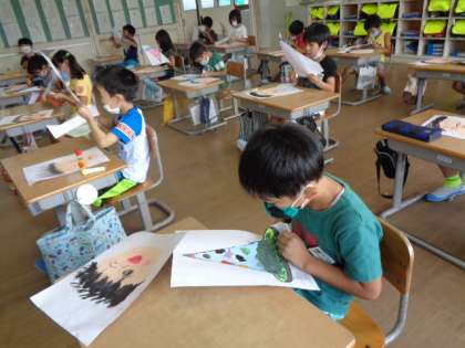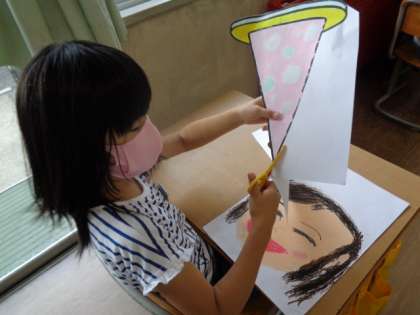 今日は仕上げをしました。お気に入りのとんがり帽子を黒い線を残して慎重に切る子供たちです。はさみの使い方が随分上手になってきました。