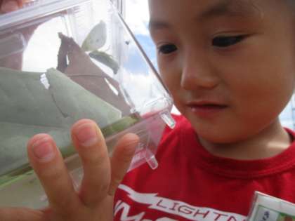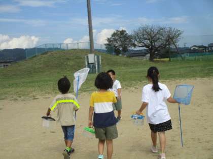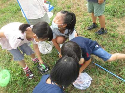 生活科の時間に、虫を探しにグランド・神保っこワールド・築山にグループごとに分かれて向かいました。トンボやカエル、バッタなどいろいろな生き物を見つけお友達と協力しながら捕まえました。