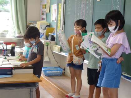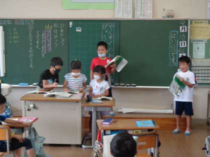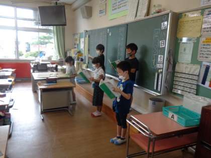 「やくそく」の音読発表をしました。今回の目当ては、「役になりきって声の出し方を工夫する」です。怒った声、優しい声、びっくりした声を上手に工夫することができました。