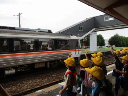 電車がたまたま通ってラッキーでした。子供たちは電車に向かって手を振って喜んでいます。