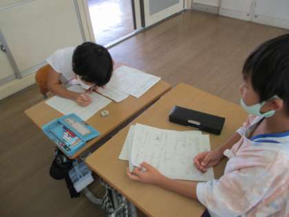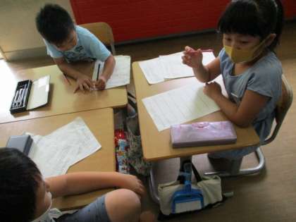 先週の町探検で見つけたもののクイズ作りをしています。子供たちは友達と一緒におもしろいクイズを考えています。