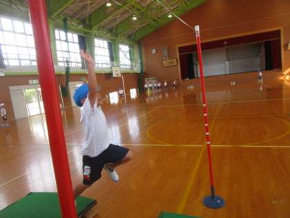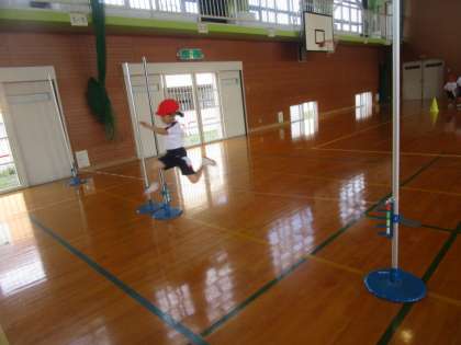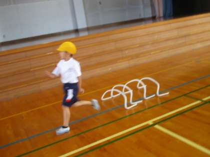 先週の木曜日に続きいろいろなジャンプに挑戦しました。ミニハードルを跳び越えたり、両足をそろえてリズムよくジャンプをしたりしました。