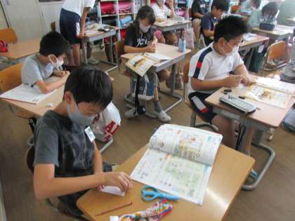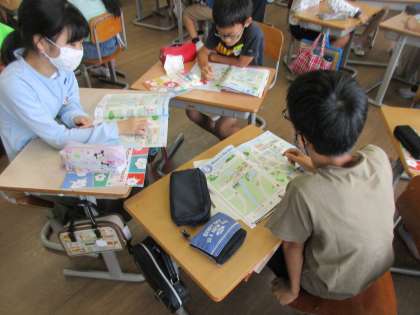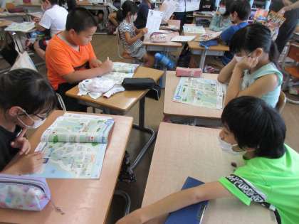 道案内の表現にも慣れてきた5年生。今日は、道案内の表現を使ってやりとりをした後、この町にあったらよい建物・施設は何か考えました。一人一人の願いが叶う町があったらわくわくしますね。今度、みんなで交流しましょう。